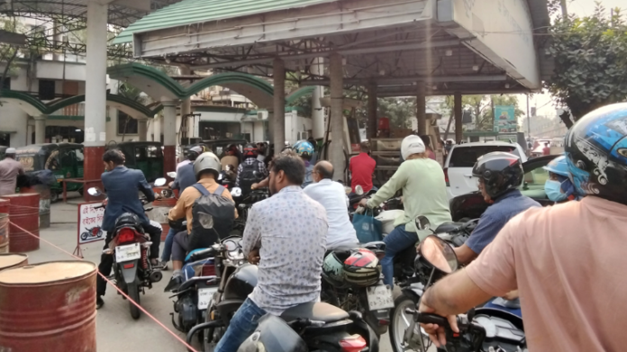 বৃহস্পতিবার পাম্পগুলোতে ব্যক্তিগত গাড়ি ও বাইকের দীর্ঘ সারি দেখা গেছে, কোনো কোনোটির দীর্ঘ সারি পাম্পের সীমানা ছাড়িয়ে সড়কেও চলে আসে।